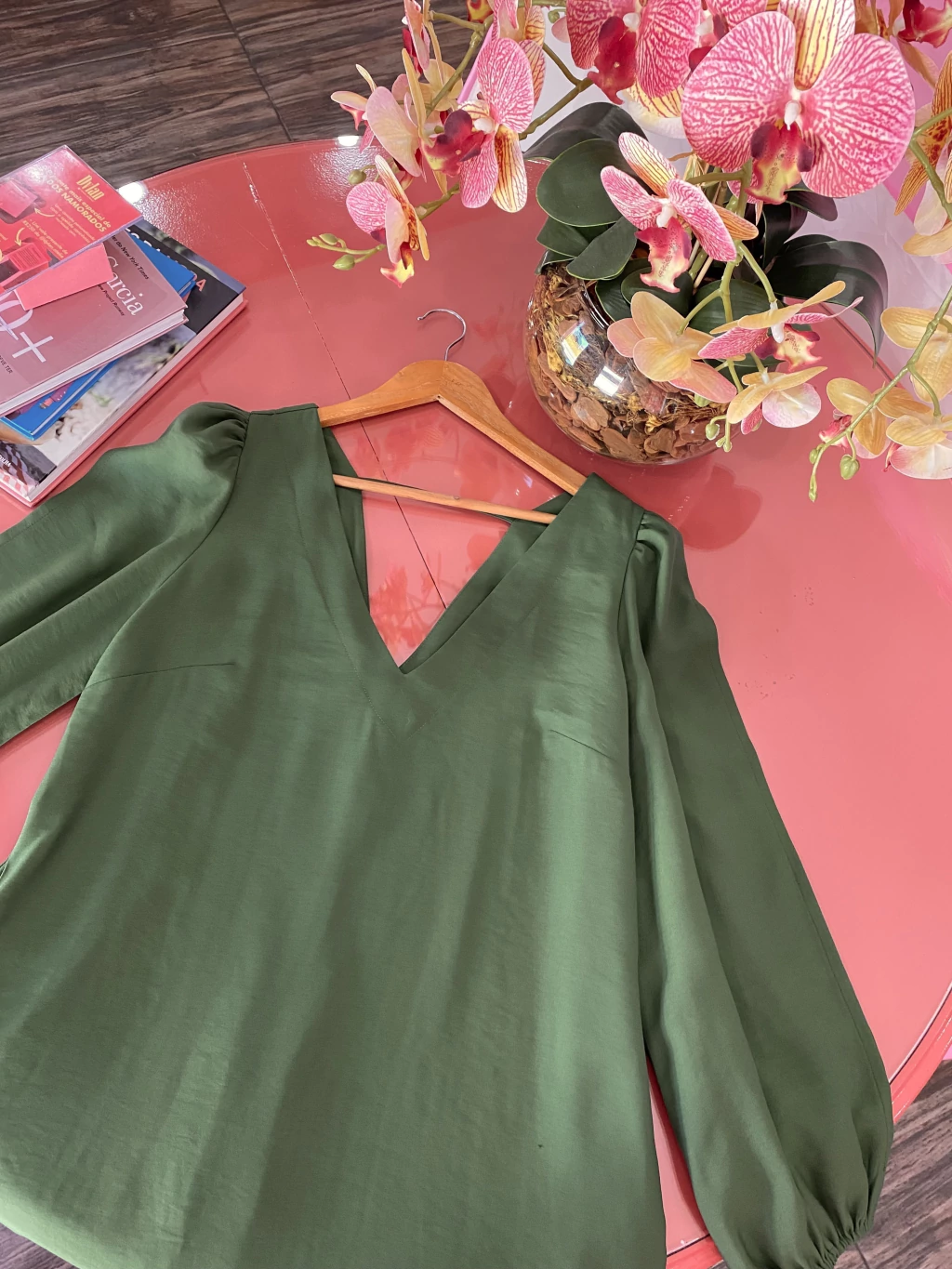 • MODELAGEM: Decote V, shape em A, manga bufante com fenda e elastico no punho. Bolsos laterais funcionais. Atrás e comprimento é mais alongado, decote V nas costas com tira de sustentação (não deixa a manga escorregar).